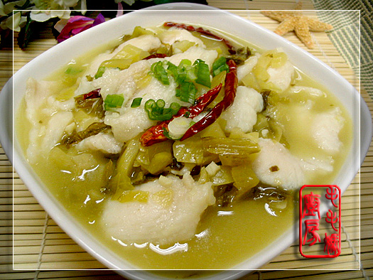 用料: 1:冰冻龙利鱼柳一大片450g,洗净擦干切片(注意厚薄均匀),加1/3茶匙盐,1大匙生粉,白胡椒1/8茶匙拌匀腌20分钟。 2:酸菜1袋300克,水冲洗一下切小块。 3:橄榄油2大匙,蒜蓉1大匙,干红辣椒4个。 4:绍酒1大匙,盐1/3茶匙,糖1/2茶匙,水2杯。 5:葱花2茶匙,鸡精1/4茶匙,香油2茶匙。 做法:大炒锅内放橄榄油2大匙置炉上,开大中火,放入蒜蓉干红辣椒炒香,接着加入酸菜炒透。接着加入4料煮滚,然后倒入鱼片划散煮到快断生时,加葱花鸡精香油兜匀鱼片刚熟出锅。