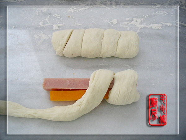 两小时后,案板上撒点干粉,将发好的面团分成16份。每份揉成1厘米直径的长条,各取一条火腿和芝士条,将揉好的长条面块一圈圈绕上火腿和芝士条。