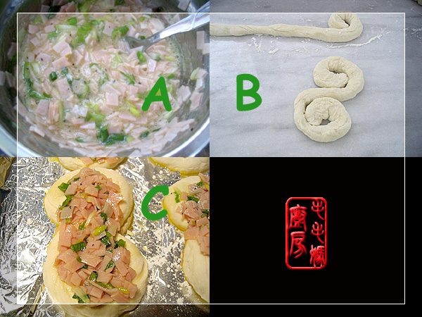 发面: 1.牛奶1/2杯,水1杯,玉米油2大匙,白糖1大匙,中筋面粉3杯 (All purpose flour,3 cups),快速发酵粉2茶匙。葱香火腿馅: 2:火腿(Cooked ham)200克切末,葱花4大匙,鸡蛋1个,黑胡椒1/4茶匙。 做法:将1料依次放入面包机内,面包机放至揉面档,开启。取一小盆放入收有的2料拌匀做馅(图A)。两小时后,案板上撒点干粉,将发好的面团分成16份。每份揉成1厘米直径的长条,松松地卷成8字形(图B),将做好面包坯放入撒了点面粉铺了锡箔纸的烤盘上入烤箱,醒30分钟到1个钟头左右。然后将火腿葱油馅均匀的放到面包坯上(图C)。