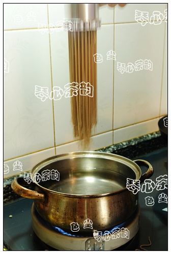 3、醒好的荞麦面团揪一小团塞到饸饹机里,转动旋转杆,把挤出来的荞麦条下到锅中煮熟,然后过凉水