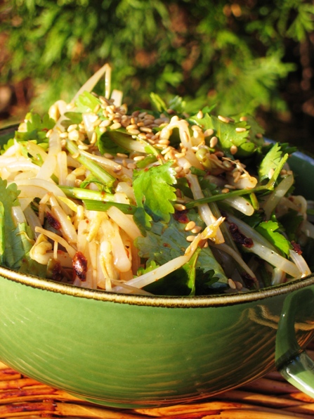 做法:豆芽用开水烫1分钟捞出,去水分,加入切段的香菜,盐糖,香油拌匀即可。