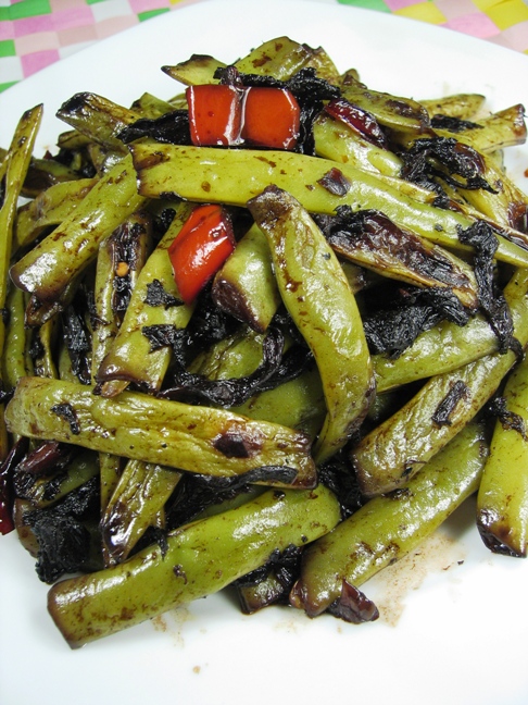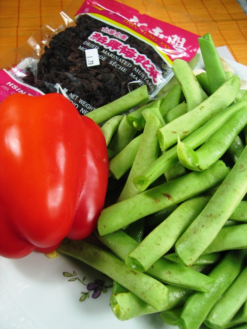 决定吃一段素食,食肉者勿入! 霉干菜煸豆角 做法:大蒜干辣椒炒香后,放霉干菜炒1分钟,然后放入豆角和红辣椒,中火闷12分钟(中间要搅一搅,以免糊锅),放糖和少许生抽闷3分钟即可。