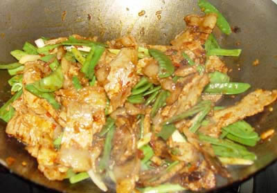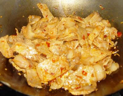 热锅凉油,中火,下肉片炒散,下豆瓣混合煸炒,至肉片起灯盏窝 下甜面瓣炒香,下配料,鸡精,酱