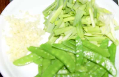 姜蒜切末 蒜苗切段 要多吃蔬菜,加点焯过水的豌豆角