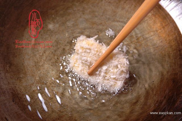 5.起锅放油,用筷子轻轻夹起裹好面包屑的鳕鱼柳小心放入四成热的油锅中。