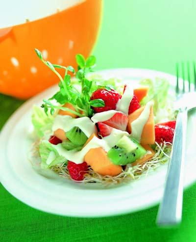 ![]() 水果色拉 份量: 1 人份 材料:草莓1粒、猕猴桃15克、西瓜15克、哈蜜瓜15克、生菜少许 调味料:雀巢炼奶2大汤匙 做法: 1. 将生菜洗净泡冰水使之清脆,草莓对半切开,其它水果均切丁备用。 2. 将生菜铺底,水果丁置上,最后摆上草莓,淋上雀巢炼奶即可。 小技巧:生菜泡冰水能让食材口感变得更脆、更爽口。 小贴士:1.水果搭配雀巢炼奶