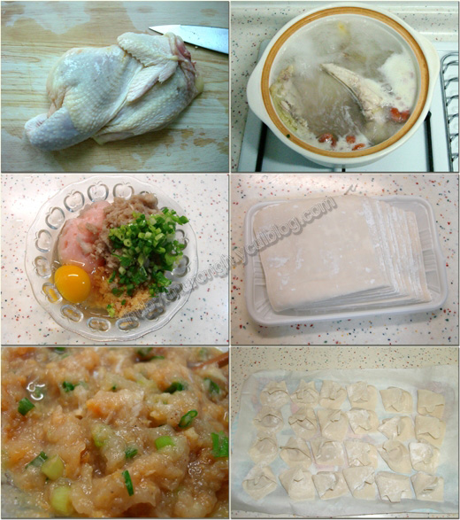 做法: 瘦肉、虾、鸡蛋、调料拌馅,包好馄饨备用; 鸡先用枸杞、鸡汤煮开,再煮上十分钟吧; 馄饨用开水煮到浮起捞出倒进鸡汤锅里再滚即分钟吧就好了。 MEMO: 为什么要用鸡汤呢,如果煮上一个小时,这个汤的味道一定非常好,可是鸡就没法吃了,用鸡汤的话就汤也好,肉也好的说。