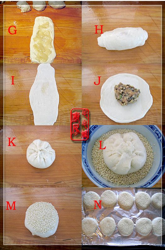 手上和工作台上涂点玉米油,然后将发好的发面团,揉捏成2厘米直径的条,再揪成20份做水皮,记住一定不要加干面粉来揉面。油皮也分成20份。 水皮一份擀成长圆形薄饼,取一份油皮均匀抹在擀开的水皮上(图G),从一端卷成筒(图H),压扁后再沿纵向擀开(图I)。再如上卷成筒后擀开,然后卷成筒静置5分钟,接着压扁擀成圆饼状,包上1.5大匙馅料(图J),收口捏紧(用包包子、饺子的手法都行,目的是将口捏收拢)(图K)。将包好的饼坯在盛白芝麻的小碗里沾上一面芝麻(图L),然后翻转放案板上,用手压成长圆饼状(图M&N)。