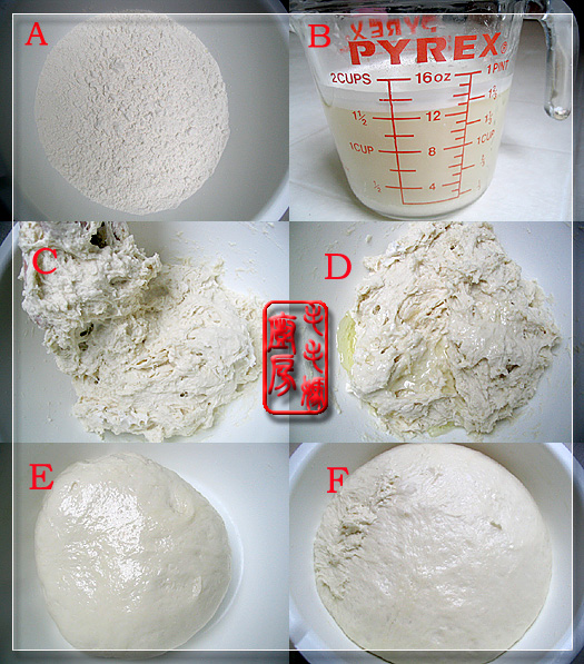水皮:将2料(图B) 倒入1料(图A)中,和成大块面团(图C)。这时面团粘手,可往面团上倒15毫升玉米油(图D),再揉成软面团(图E)。这一步是关键,面一定要和得非常软,烤出来的蟹壳黄才会是脆软酥松。放在暖和的地方保湿,等到面团发至原来的两倍大(图F)。