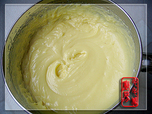 “蓝天使之吻”--蓝莓乳酪蛋糕 做过的好几款乳酪蛋糕中,这一款是我们家和朋友们的最爱。大家都说比买的好吃~ 最近的一次聚餐上,蛋糕差点引起朋友的“家庭纠纷”。为了省事,我简化了许多步骤,用料也尽量健康,有兴趣的可以来试试。 用料: 1:原味乳酪 (CRAFT Philadelphia, cream cheese) 250克,在室温静置软化。 2:蛋黄7个,打散备用。 3:玉米粉3大匙,中筋面粉3大匙,牛奶1.5杯,糖3/4杯,玉米油1/4杯。 4:蛋白7个,塔塔粉1茶匙或白醋1茶匙。 5:冰冻蓝莓1/2杯,室温静置30分钟后,用纸巾稍擦干。1.5大匙中筋面粉。 注: 1杯=240毫升 1大匙=15毫升 1茶匙=5毫升面都是直接从面粉袋里舀的,事先没筛过。 做法:用两个盆分别盛蛋白和蛋黄。蛋白加白醋1茶匙用搅拌器高速打几分钟,打发好的成品当盆翻转时蛋白不会流出。接着用搅拌器高速打蛋黄半分钟。将所有的3料放入一不锈钢锅里搅拌均匀,然后放入蛋黄拌匀,置炉上开中小火,边搅拌边煮至浓稠离火,稍冷用搅拌器高速打2分钟,像这样。