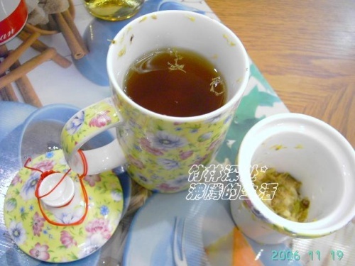 [竹林丝语]~昨晚喝一杯参菊花茶神奇地止好咱大胃王的肚泻啦~其实五花茶至好~屋企无备~比短信咱大胃王出去饮先得~这个杯子好~超市买46一个~俺们淘回来才10元~可以隔茶叶呢~