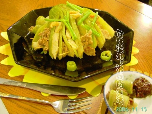 [食得是福]~鲜~ 用刀叉现切现吃~也可以砧板切后上桌~ 制作: 1.将干虾米\金华火腿\鸭肾干(小小)加(直饮)水煮沸~ 2.青萝卜切片留根~中间一片羊肉一片五花肉~(羊肉\五花肉用古月粉\海天生抽王\石湾米酒置于塑料保鲜袋子中淹制1个小时~),加几片姜~大块方便煮起来更入味~就没片开萝卜~切断的与羊肉卷起来~ 3.待1水煮沸后~放入2煮至萝卜呈透明度~撒上葱段~(看下图煮时好肥的花肉沫漂着呢~所以不要放油喔~加点盐就行啦~)