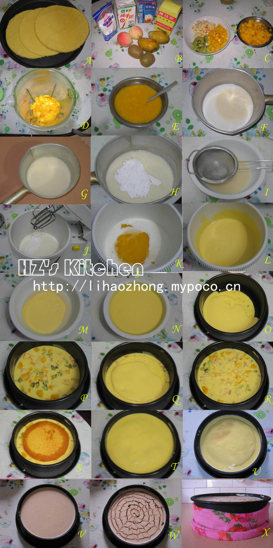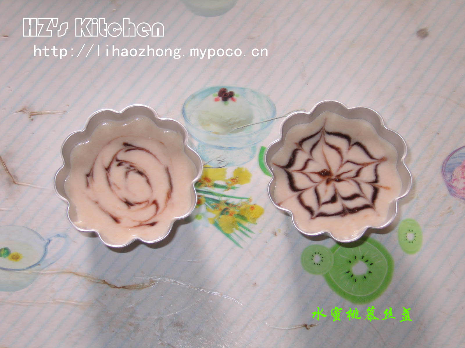 备注说明: 1、动物性奶油比较难打发,要泡在冰水里打,我的没有打得很发,做出来的慕丝有点像布丁。鲜奶油要打至湿行发泡,略微可以流动比较好。 2、我在搅拌面粉糊的时候直接用搅拌器搅拌,不知道会不会搅出筋来的哦,这次是故意的,其实平时用橡皮刀搅拌的~ 3、夹有水果的蛋糕比较爽口,也份外清新,不会过腻~ 副产品: 水蜜桃慕丝盏