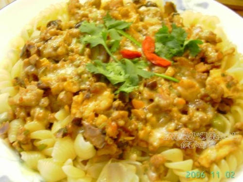 昨天余下的肉酱不如弄个意粉~ 材料:肉酱(猪肉红萝卜紫洋葱马蹄蒜头香菇海虾干),意粉(蚬壳粉螺丝粉)青豆金针菇~ 做法:意粉青豆金针菇放盐灼熟过冷河伴点葡萄籽油备用~肉酱放点点油炒熟~意粉肉酱依次装在一个微波炉适用的碟上~切点芝士洒在意粉肉酱面~盖好碗盖~入微波高火焗2分钟就好啦~ 也好好味喔~还是喜欢添加点牛奶~可惜家里没存货了~ ~~~~~~~~~~~~~~~~~~~~~~美味蚬壳意粉米饭吃得多淀粉质多对身体不好的~粗粮也不能多吃~招待朋友让她们吃个新鲜~意粉当饭食:(材料:南瓜西兰花香菇干海虾干肉沫洋葱蒜牛奶)页码:[1] [2] [3] [4] 第1页、共4页