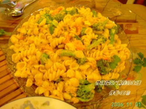 做法:香菇虾米干泡发15分钟后切丁,鲜猪肉及其他佐料均剁泥方便小朋友吃~西兰花放盐灼熟过冷河,意粉放盐煮熟过冷河沥干水份,烧热锅放油炒熟肉沫和洋葱等粒粒后伴入意粉和西兰花,倒入牛奶和直饮水适量煮沸~放点干贝素和高汤粉~收汁上碟~喜欢浓郁的可加入沙司酱~ ~~~~~~~~~~~~~~~~~~~~~~~~~~~~~~~~~~~~~ 美的享受~奶味紫洋葱鸡蛋意粉 别以为我爱喝酒呵~我可从不大喝酒只是沾沾口品味一下而已~吃这道意粉时特别特别想喝点葡萄酒~难怪人家鬼佬西餐葡萄酒佐餐呢~就一点点吧~过隐~味道就是不一样~这才是美的享受呵~ 很FB吧~现在不流行小资了