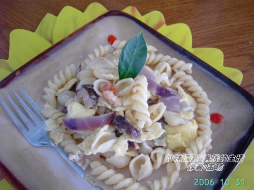 材料:蒜头紫洋葱香菇海虾干鸡蛋意粉