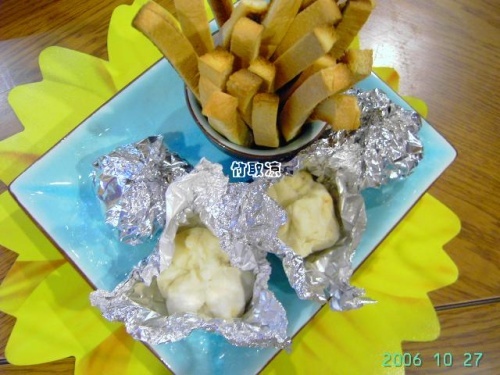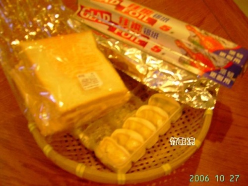 1.所需材料:吐司(咸方包)、饺子、锡纸~