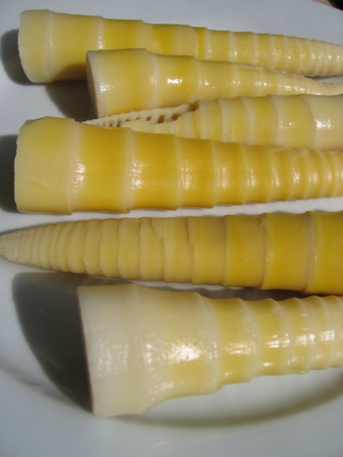 解冻鲜笋,切段。