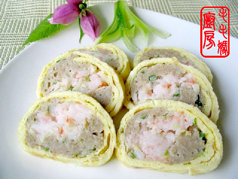 做法:将1和2料放一盆内,用一双筷子顺一个方向搅拌至馅上劲成备用。将3和4料放另一盆内,用一双筷子顺一个方向搅拌至馅上劲成虾胶料备用。煎锅放玉米油1.5大匙置炉上,开中火。放入一半的5料煎成两面微黄的蛋皮。一样做法煎好另一张蛋皮。将蛋皮铺一大盘上,靠最下面放一半的肉馅料,再加一半的虾胶料与其上。然后卷成筒,同样做好另一个三鲜蛋卷坯。两个三鲜蛋卷坯放大盘上入铺蒸锅内,大火蒸15-20分钟,切片食用。 ![]() 看看近照~~ ![]() 素一素。