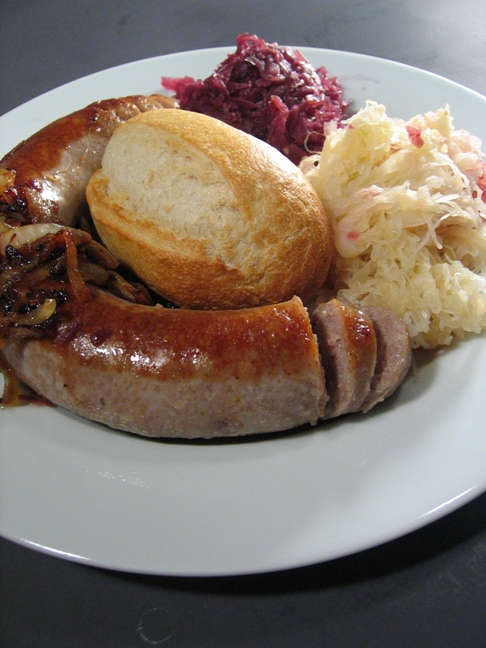 腌制红白卷心菜 做法: 油热后放香肠和切碎的圆葱,煎到两面金黄(10分钟左右)即可。红白卷心菜一热就能吃。 泡菜蛋饼: |