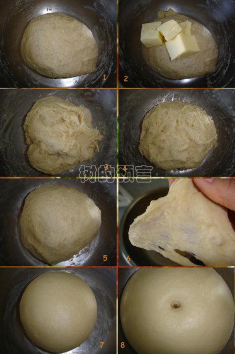 2、将材料A和材料B的全部材料揉均成面团。 3、分几次加入色拉油,揉至油面完全混合,面团光滑 4、继续揉30分钟揉出面团筋度,如下图6,收成一个光滑的面团放在盆中,放入30度左右烤箱发酵40分钟至原体积的2倍,烤箱内放一碗水(我的面团虽然光滑可是感觉太稀了不好揉所以随便揉了揉就算了,也能拉出膜但没有图中的那么薄,下次把面粉加到300克试试) 5、面团发至用手指插入,洞不回缩 ![]() 6、发酵好的面团分成9等份,揉
