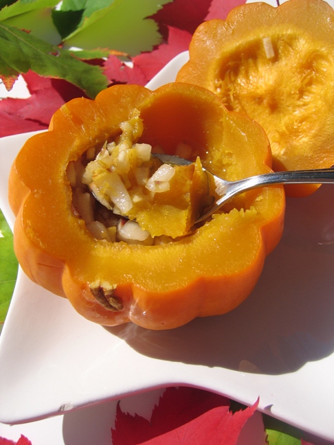 香甜入味 做法: 南瓜切开去子,半个梨子和苹果,用红糖拌匀,放在南瓜里蒸20分钟即可.