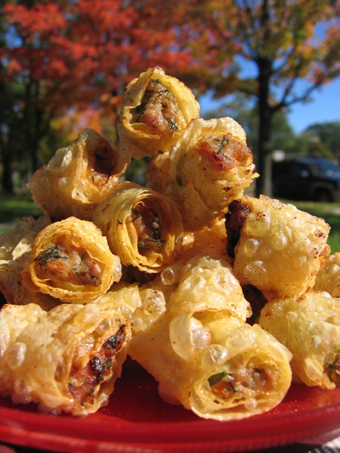 这是我们东北农村去媳妇才做的菜. 做法:泡好的豆腐皮卷腌制好的肉糜,切段,炸至金黄.