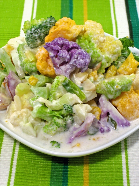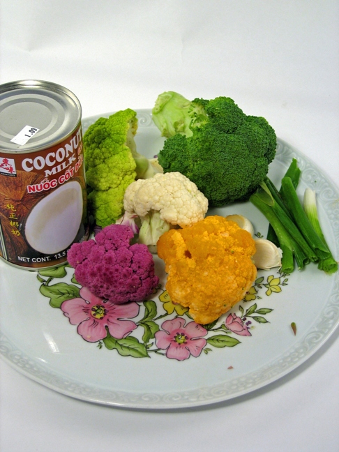 做法:大蒜炒香,放入多色菜花炒2分钟,加入椰汁和盐炒2分钟即可。