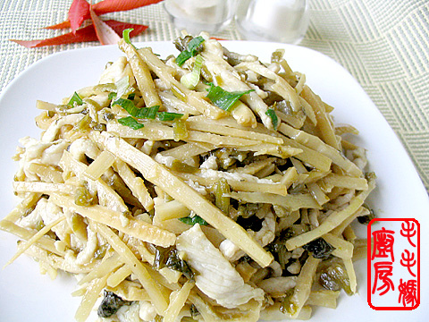 做法: 炒锅内放1.5大匙橄榄油,开大中火炒香蒜蓉,放1和3料翻炒半分钟,加4料再炒1分钟。接着加2料炒至肉丝断生,加5料兜匀撒上葱花即成。
