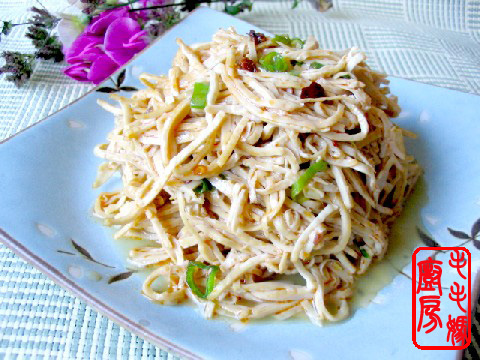 用料: 1:云丝一盒200g。 2:辣油1.5大匙,鸡精1/3 茶匙,盐3/4茶匙,糖1/2茶匙,金兰酱油膏1大匙,老干妈辣椒酱1大匙,香油1大匙。 3:橄榄油1大匙,葱花1大匙。 做法:将干云丝放一大盆里,加开水泡20分钟。用清水漂洗2-3次,再用开水冲一次沥水。炒锅内放橄榄油1大匙置炉上,开中火放入葱花炒香离火,加2料拌匀成汁,接着加沥干水的云丝,拌匀即可。