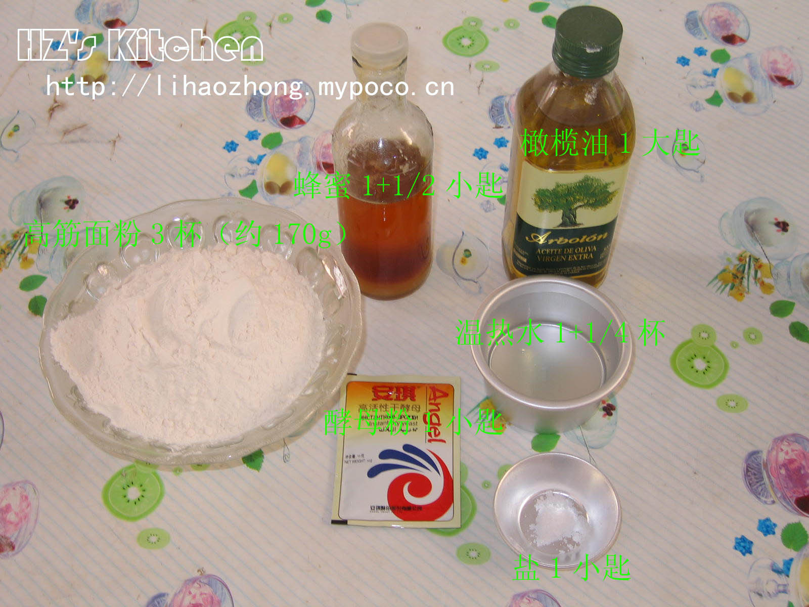 二)做法: 1、餅餅的做法 : (1)混合1/2杯溫熱水及1/2小匙蜂蜜, (溫度需41-45度c). 加入1小匙酵母粉, 灑上1/2杯麵粉,拌勻. 蓋上濕布或保鮮膜,放置溫暖無風處, 靜置20分鐘.