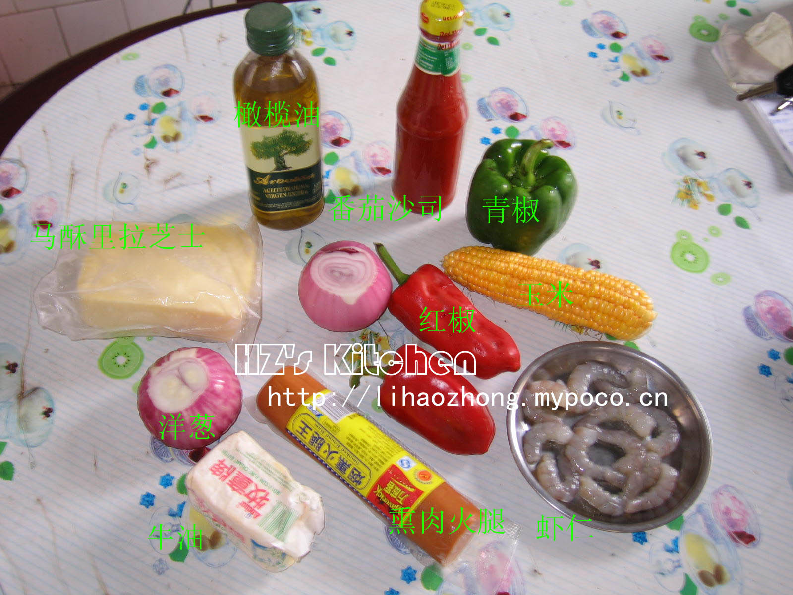 ![]() 2、陷料: 橄欖油、牛油、番茄沙司、紅椒、青椒、洋蔥、熏肉火腿、玉米、蝦仁、芝士粉、馬酥裏拉芝士