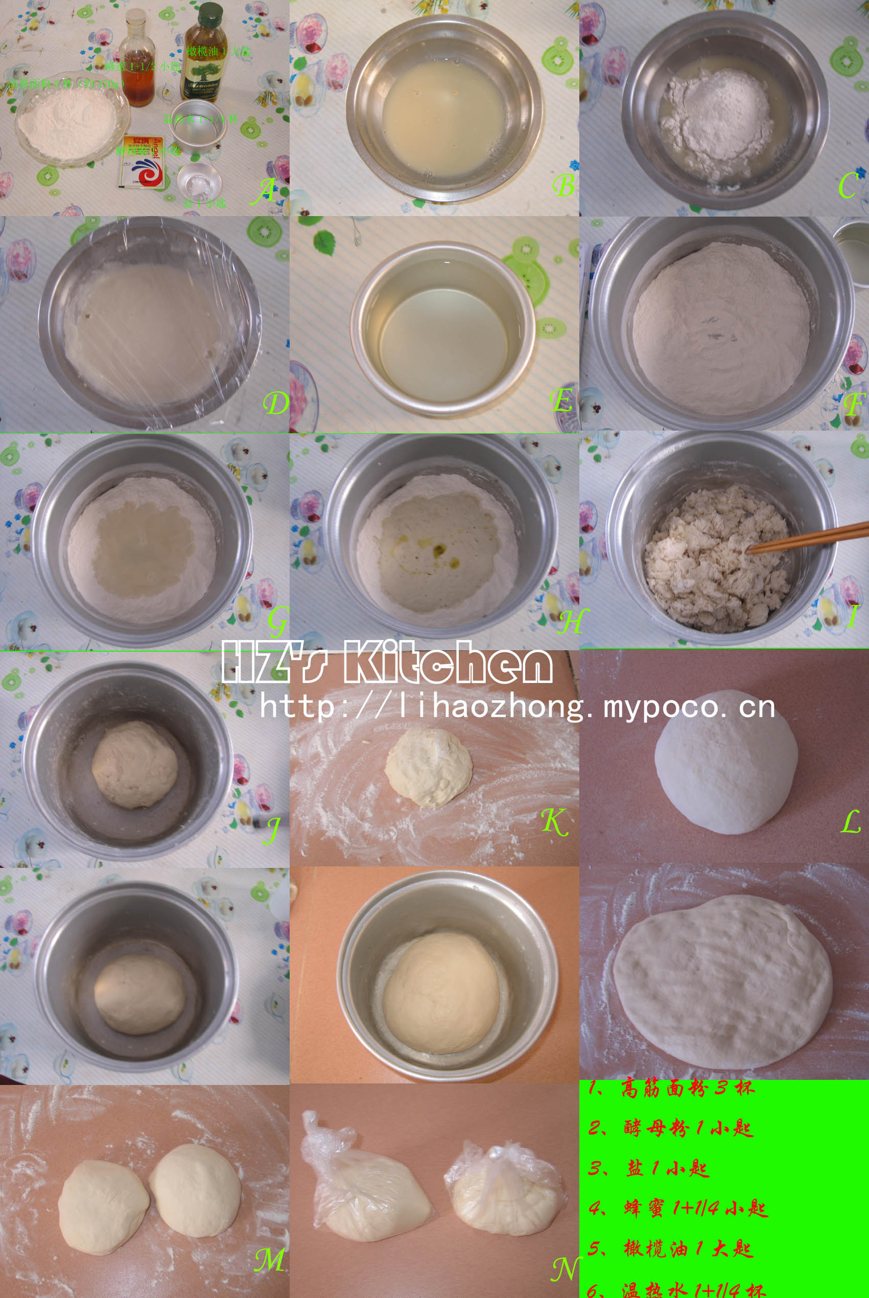 (3) 在一大缸盆中將(2)中的粉料圍成一道粉牆(中間低四周高). 倒入溫的蜂蜜水,(1)麵糊及橄欖油, 用筷子或大木匙混合. 並用雙手捏成麵糰 (此時麵糰會非常濕黏). 在大缸盆中揉5-10分鐘至麵糰不沾黏缸盆. (4) 桌上灑點麵粉, 雙手拍些手粉.將麵糰置於桌面揉10分鐘至麵糰表面光滑. (用機器則前後共揉10分鐘左右),此時麵糰應該蠻濕潤柔軟的.但不黏手 (5)发酵: A、將麵糰置於抹上油的缸盆內.讓麵糰雙面都沾上油以保濕. 蓋濕布發酵1~~1+1/2小時.(控溫約28度c左右). 讓麵糰發至一倍大. B、用拳頭重搥一兩下麵糰.將麵糰內空氣釋出. 將麵糰切為兩半. C、在麵糰表麵撲些麵粉. 裝在密封袋中, 放置冷凍室30分鐘(讓酵母活力降低. 若直接放冷藏會持續發酵脹大). 隨即放於冷藏.備用.