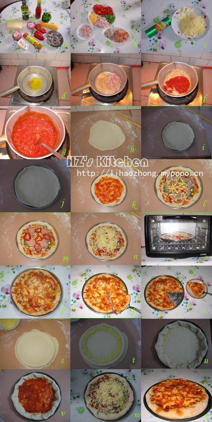 3、其他准備:把紅椒、青椒、洋蔥、熏肉火腿切成丁,玉米削粒,馬酥裏拉芝士刨成絲備用 4、做法:台面上撒上面粉,取一面團,稍微滾圓,用擀面杖擀開至烤盤大小。烤盤抹油或撒上玉米麵粉。將麵糰放烤盤上整型成pizza 皮。用叉子在餅皮擢上洞洞。在熱烤箱至 250度。在pizza 皮擦擦上一層番茄醬,然後撒上一層芝士絲,再放上蔬菜丁、熏肉丁和蝦仁,最後再撒上一層芝士絲 ,入爐烘烤30分钟。取出pizza,放烤架上等兩三分鐘,讓底部濕氣散出之後即可食用。可在上面撒上芝士,更加香浓哦。