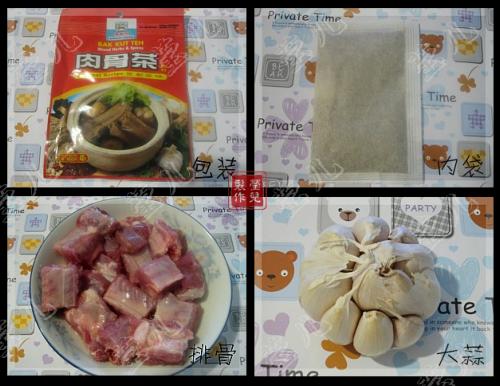 材料:那一包红红的就是核心所在了,里面一共2小包,就象袋庄茶包一样的,方便,接下来主角当然是排骨,也可以是其他的肉类,还按说明书上准备了不剥皮的大蒜<!---->