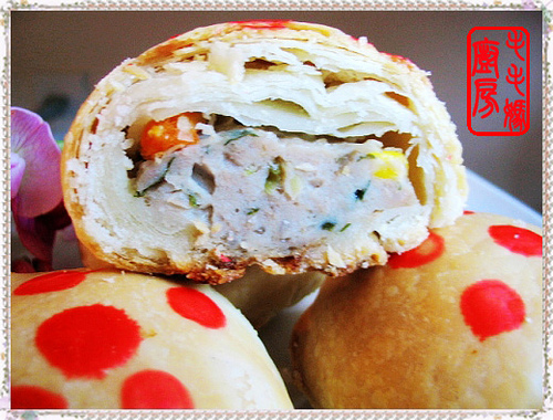 水皮: 1:中筋面粉(All purpose flour) 2杯,没过筛,加盐1/2茶匙拌匀。 2:水2/3杯,玉米油1/3杯。油皮: 3:中筋面粉1杯,玉米油1/3杯。 馅料: 4:浙江榨菜1袋,水泡30分钟,冲洗一下切细粒。 5:精瘦猪肉馅300g(Costco, extra lean ground pork),冰冻蔬菜1大匙。 6:葱2 条切碎, 姜末2茶匙。 7:鸡蛋清1只,鸡精1/2 茶匙,生粉1大匙,盐1/3茶匙,香油1大匙,白胡椒1/4茶匙,水1大匙,绍酒1大匙。