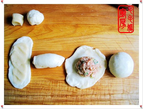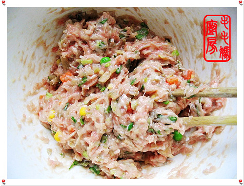 做法:馅料:取一盆,放4,5,6和7料拌匀。用筷子顺一个方向搅拌至馅上劲。
