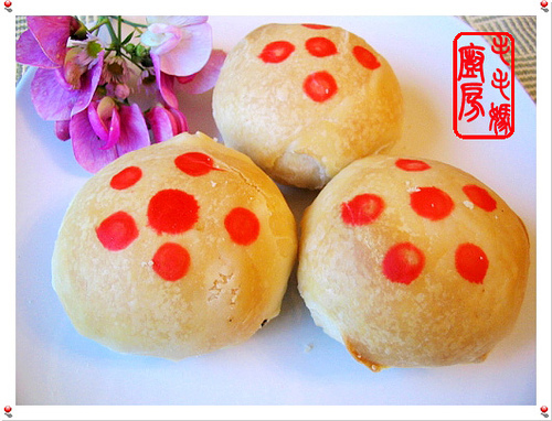 水皮和油皮分别揉成光滑面团,静至30-60分钟。将水皮和油皮等量分成16份,每份水皮擀薄饼,然后把一份油皮均匀抹上,从一端卷成筒,压扁后再沿纵向擀开。再卷成筒,压扁擀成圆薄饼,包上1.5-2大匙馅料,口捏紧,用手稍压成圆饼状。用筷子沾上红色或绿色食用颜料水在饼上点几个点。