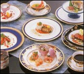 怀石料理 煎茶之前的膳,为了不影响品茶的乐趣,料理的味道和用料分量十分讲究。茶馆主人按季节,精心推选新鲜海产和蔬菜,烹调落足心思。怀石料理讲究环境的悠静,料理简单而雅致。