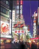 大阪市戎桥以南是一整片美食的天堂,走过戎桥往左边看,以灯笼装饰而成的「道顿堀商店会」大路标,很招摇地伫立在路中央。放眼望去全是餐饮店,寿司、拉面、烧肉、串烧、炸虾、乌龙面、关东煮、居酒屋参差林立,也有不少卡拉OK、电动玩具夹杂在其中。江户时代的道顿堀集合了不少歌舞伎