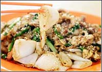 ![]() 喜欢炒棵条的鲜热锅气,又喜欢猪肠粉的弹牙可口,一定会爱上这道独家炮制的炒猪肠粉。 炒猪肠粉的配料包括菜脯、苏东、鸡蛋、猪肉丝、鲜虾、青葱,上菜前再洒点芝麻。如果要减少肉食,还可以要求老板娘炒净菜心猪肠粉。 老板娘苏莲珠告诉记者:“这道炒猪肠粉是我先生三四十年前想出来的。不过,他七八年前走了,已经不在了。这道菜至今仍有