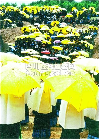 布拖过去是没有黄伞的,人们挡雨都是靠身上的蓑衣,可是自从上世纪七十年代县区供销社开始销售黄伞,酷爱黑色的布拖彝族居然热爱黄灿灿的雨伞,并渐渐在布拖全境内流行开来,以至于每个姑娘几乎都有一把黄伞,以前是黄油纸伞,现在大多流行黄布绸伞。
