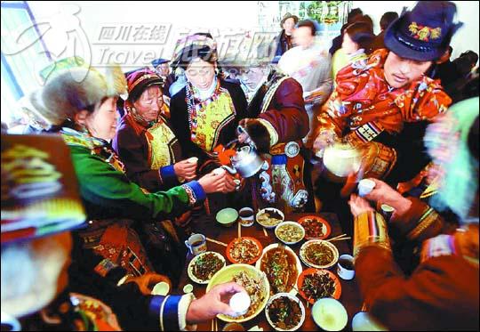 新郎新娘为客人斟上美酒 墨龙村地处小金县抚边乡,是藏语嘉绒方言区中一个极有特色的寨子。 春寒未过,一个阳光温暖山野的日子,我和几位朋友来到墨龙村,走近这个古老的民族,参加藏族青年杨永祥与卓玛的传统嘉绒婚礼,感受嘉绒藏族的婚礼习俗。 婚礼前夜称作花夜。新郎要在祖屋的锅庄旁接受长辈与平辈人的祝福,当地称作挂红。 婚礼举行的当日清晨,是新娘在亲友的相送下来到新郎家的日子。一大早,在祖屋