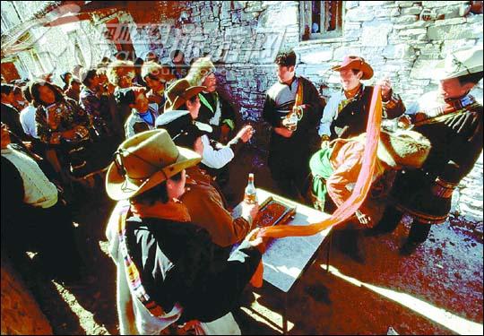 新娘和家人返回娘家必须过“拦红”关,对歌喝酒后方能过关这一天敬酒是敬“哑巴酒”,即新郎新娘在任何时候都不能说话,敬酒的话由伴郎伴娘代为表达。能歌的亲友,则在敬酒时高唱藏族的敬酒歌,其中墨龙村的敬酒歌———《阿拉江瑟》,是唱得最多的。一