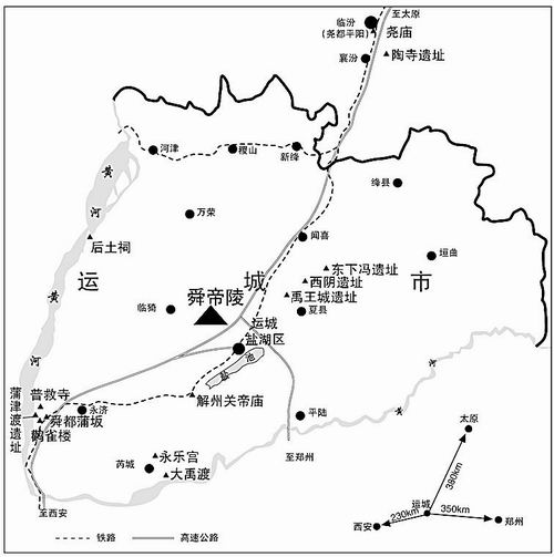 舜帝陵位置及运城文化遗存分布图 ●晋南是上古时期历史舞台的核心 ●山西运城是虞舜文化的主要发祥地 ● 舜帝卒葬在山西运城盐湖区鸣条舜帝陵符合当时社会条件 论虞舜 学界河东举盛会 九月的河东,金风送爽,硕果飘香。由中国先秦史学会、中共运城市盐湖区委、运城市盐湖区人民政府联合举办,运城市盐湖区人民政府承办,山西省社科院协办的全国虞舜文化学术研讨会暨中国先秦史学会第八届年会于9月5日至7日在风光秀丽的山西运城盐湖区鸣条舜帝陵庙——中国先秦史学会尧舜禹研究基地隆重举行。来自北京、上海、天津、重庆、黑龙江、贵州、甘肃等全国26个省、市、自治区及日本的130多位先秦史学专家学者对虞舜文化进行了广泛深入的研究探讨。 虞舜(舜帝)是我国上古时期的一位圣君,以贤德孝行著称,与黄帝、颛顼、帝喾、尧帝并称“五帝”。《尚书·舜典》载:“德自舜明”。《史记·五帝本纪》云,“天下明德皆自虞舜始。”舜倡导为人、持家、做官、治国均以道德为大本,开创了中华道德文化之先河,被后人尊为“道德始祖”、“百孝之首”、“文明之元”,深受海内外华夏子孙的尊崇和敬仰。由舜帝而滋生的虞舜文化,是中华民族优秀传统道德文化的肇始和根源,深入挖掘和研究虞舜文化,对于探寻中华文明之源,传承道德文明,弘扬民族精神,促进社会主义物质文明、*文明和精神文明建