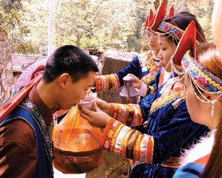 男方迎亲队伍,一路浩浩荡荡,好不热闹 男方赤郎要喝过3碗女方家酿制的酒,方能上路。