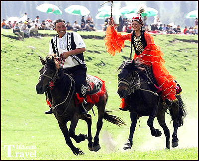 近日去新疆出差,对新疆有趣的风俗民情和美丽的风景略有认识,现拈来几支献给朋友们。 ![]() “姑娘追” “姑娘追”是以畜牧业为主,过着逐水草而居的游牧生活的哈萨克青年男女之间表达爱情的一种传统活动。每当在传统的哈萨克族节日活动开始时,小伙子与自已看中的姑娘骑马并肩向远方的山中行去。一路上,小伙子可以向姑娘倾吐爱慕之意、开玩笑。姑娘无论是否愿意,都不能生气,任由小伙子说。 到了折回时,小伙子提心吊胆