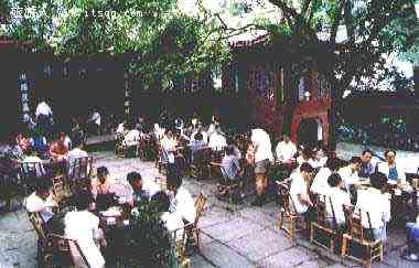 四川茶馆除了休闲之外,还是重要的社交场所。在旧社会,三教九流相聚在此,不同行业、各类社团在此了解行情、洽谈生意、看货交易;*买卖*、鸦片也常在茶馆进行;袍哥组织的“码头”也常设在茶馆里。这些茶馆大多还兼营饭馆、旅店。每逢寒暑
