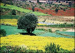 高山崎路上,大黄芝麻花漫山遍野。 茶座都是小号的,包括茶几,摆着中国式简陋茶具。中国茶以外,当地的缅甸