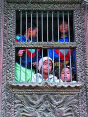 有人说尼泊尔人在接受现代文化的时候就像穿上了一件外衣,仍保有着古老的内心,但是“对尼泊尔我们需要足够的耐心”,桑吉这样说,“有一天,你将无法再准确地分辨那所谓的外衣,因为它将会被吸收和改变”。 每当来自印度洋的慵懒气息遭遇喜马拉雅山脉沉静苍凉的面额,雾气又开始弥漫于清晨的尼泊尔。就像这个国家正在历经的种种过往与将来、微笑与伤痛、幻象与觉悟……仿佛一切都被包裹在通向真谛之路的又一场迷津里。尼泊尔正在明昧莫测中分辨脚下的来路和前程,这个清晨异常漫长。 从家里的窗户看着外面的尼泊尔孩子。 各种印度明星的艳丽笑容耸立在城市上空,所有能想到的横行世界的品牌在这里都能见到广告,争相诉说着来自日本电饭煲、DOVE香皂、中国摩托一类的幸福生活。